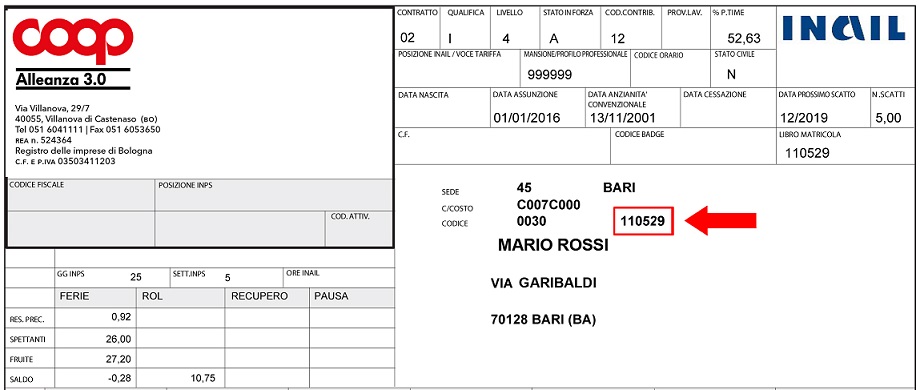 “Matricola”: inserisci il tuo codice matricola. Se non sai qual è, lo puoi recuperare da una qualsiasi delle tue busta paga: